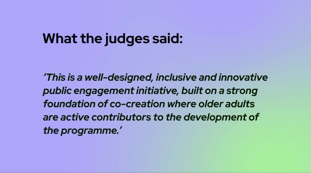 What the judges said: “This project is a well-designed, inclusive and innovative public engagement initiative, built on a strong foundation of co-creation where older adults are active contributors to the development of the programme.”